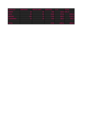 Este documento presenta un resumen de las ventas de diferentes artículos con sus cantidades, precios unitarios, subtotales, IVA y total por artículo. Luego presenta el total general de la venta que asciende a $5805.6.