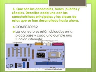 El documento describe diferentes componentes de una computadora como procesadores, memorias, discos duros, conectores, buses, puertos y zócalos. Explica las unidades de medida de cada componente y los tipos principales de cada uno, como buses paralelos y seriales, y puertos como USB, VGA y RJ-45. También incluye biografías breves de Steve Jobs, Bill Gates y orígenes de empresas como Apple y Microsoft.