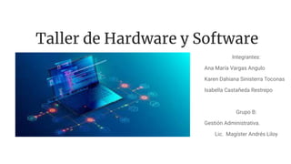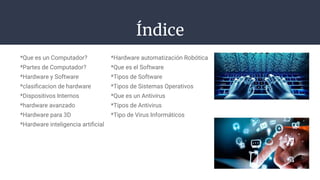 Este documento describe diferentes tipos de hardware y software de computadoras. Explica las partes principales de un computador, incluyendo dispositivos de entrada, salida y almacenamiento. También describe varios tipos de hardware avanzado, como hardware para gráficos 3D, inteligencia artificial y automatización robótica. Finalmente, explica conceptos de software como sistemas operativos, antivirus y tipos de virus informáticos.