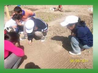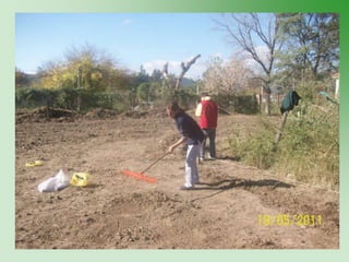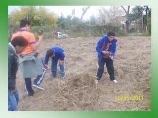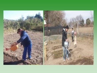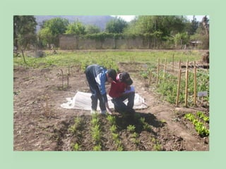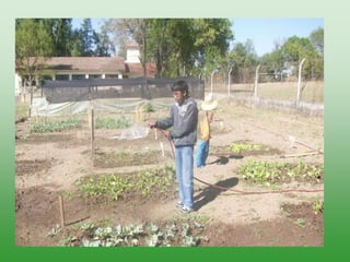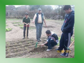 El proyecto Huerta tiene como objetivo enseñar a los jóvenes sobre la creación y mantenimiento de una huerta, promoviendo habilidades laborales y la interacción cooperativa. Las etapas del proyecto incluyen desde el marco teórico en el aula hasta la cosecha y evaluación del proceso productivo. La propuesta busca generar autonomía en los estudiantes y mejorar su confianza personal en actividades productivas.