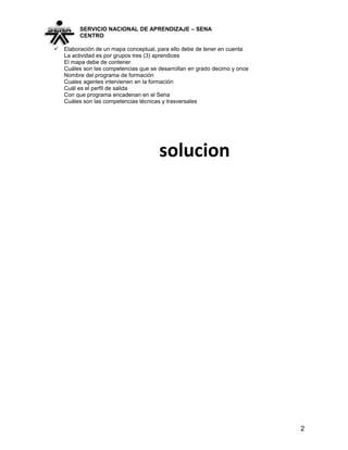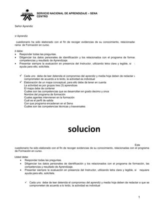 Este documento presenta un cuestionario para aprendices del Servicio Nacional de Aprendizaje (SENA) en Colombia. El cuestionario incluye preguntas sobre el programa de formación y competencias adquiridas. Los aprendices deben responder todas las preguntas de forma individual y presentar el cuestionario ante su instructor. También deben redactar sobre su compromiso personal con el programa y elaborar un mapa conceptual en grupo que describa aspectos clave del programa como competencias, agentes involucrados y perfil de salida.
