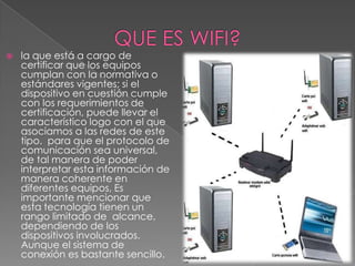 Este documento contiene información sobre varios temas tecnológicos como el wifi, los wikis, los libros electrónicos y la Web 2.0. Explica que el wifi usa ondas electromagnéticas para la comunicación inalámbrica, que los wikis permiten que múltiples usuarios colaboren en la creación de páginas web compartiendo conocimiento, que los libros electrónicos permiten publicar obras literarias de forma independiente y a bajo costo, y que la Web 2.0 facilita el compartir y colaborar entre usuarios