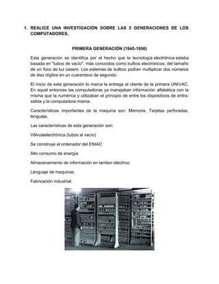 Este documento presenta un resumen de 5 generaciones de computadores, describiendo las características principales de cada una. También define conceptos como sistema operativo, Internet, Web 2.0, Web 3.0, inteligencia artificial, Skype, Oovoo y antivirus. Finalmente, pide crear una cuenta de Gmail y compartir la actividad usando Google Docs.