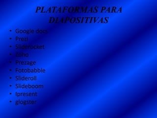 Este documento presenta varias plataformas para crear diapositivas en línea como Google Docs, Prezi, Sliderocket, Zoho y otros. Describe las características principales de Google Docs, Prezi y Sliderocket, incluyendo su historia y funcionalidad. Google Docs permite crear documentos y presentaciones de forma colaborativa en la nube de manera gratuita. Prezi se diferencia de PowerPoint al permitir organizar la información de forma no lineal en un solo marco. Sliderocket ofrece planes de suscripción para crear, administrar y compartir