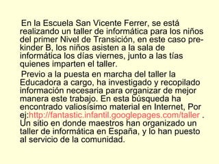 En la escuela San Vicente Ferrer, se está llevando a cabo un taller de informática para niños de pre-kinder, utilizando recursos en línea y el proyecto gubernamental Kidsmart. El taller busca desarrollar habilidades técnicas en el manejo del computador y ampliar los contenidos curriculares a través de aplicaciones multimedia. Se han planificado sesiones específicas enfocadas en el uso del ratón y en el conocimiento del cuerpo humano, apoyadas por sugerencias para que los padres colaboren en casa.