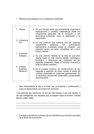 Este documento presenta un resumen de tres puntos clave sobre la teoría de la evolución: