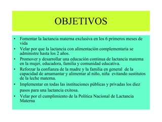 El seminario taller de lactancia materna tiene como objetivos fomentar la lactancia exclusiva hasta los 6 meses, promover la educación continua sobre el tema y asegurar prácticas adecuadas a través de políticas y grupos de apoyo. Se destacan los beneficios de la lactancia tanto para el bebé como para la madre, además de abordar dificultades comunes y estrategias para superarlas. El documento también detalla pautas sobre la alimentación complementaria adecuada desde los 6 hasta los 24 meses y la importancia de mantener la lactancia durante este periodo.