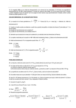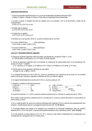 Este documento presenta una serie de 34 ejercicios sobre magnitudes físicas y unidades de medida del Sistema Internacional. Los ejercicios cubren temas como prefijos, conversiones de unidades, cálculos dimensionales, problemas con masa, volumen y otras propiedades físicas. El objetivo es practicar el uso correcto de unidades y dimensiones en diferentes problemas cuantitativos relacionados con la física.