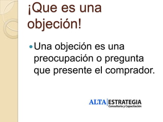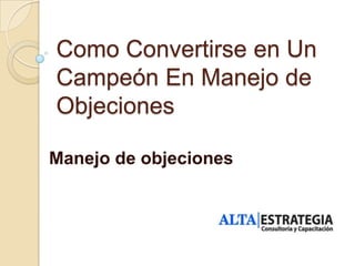 Este documento ofrece consejos para manejar objeciones de clientes potenciales. Explica que una objeción es una preocupación o pregunta del comprador. Recomienda anticipar posibles objeciones y conocer bien los productos o servicios que se ofrecen. También sugiere identificar y eliminar riesgos percibidos por el cliente equilibrando los riesgos con las recompensas de realizar la compra.