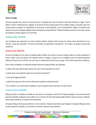 Este documento describe un taller sobre derechos sexuales y reproductivos que utiliza el juego "Escaleras y toboganes". El juego implica formar grupos que avanzan por un tablero respondiendo preguntas y completando tareas basadas en tarjetas de diferentes colores que abordan estos temas de manera lúdica y dinámica, con el objetivo de estimular la participación y el debate bajo la guía del tallerista.