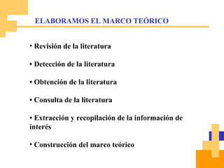 El documento presenta información sobre la revisión de literatura y la construcción del marco teórico en una investigación. Explica los pasos para revisar la literatura existente, incluyendo la detección, obtención y consulta de fuentes primarias, secundarias y terciarias. También describe la importancia del marco teórico y ejemplos de su construcción, así como conceptos clave como variables e hipótesis.
