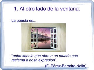 Este documento presenta un taller de poesía para estudiantes de secundaria que explora diferentes lugares y formas en que se puede encontrar la poesía. Se discuten temas como la poesía en la ciudad, en los recuerdos y sueños, y en objetos cotidianos. Se proponen varias tareas creativas como escribir poemas basados en imágenes, sonidos o sobre lugares donde se encuentran objetos más pequeños. El documento sugiere que la poesía puede estar en muchos lugares inesperados y anima a los estudiantes a expresarse a