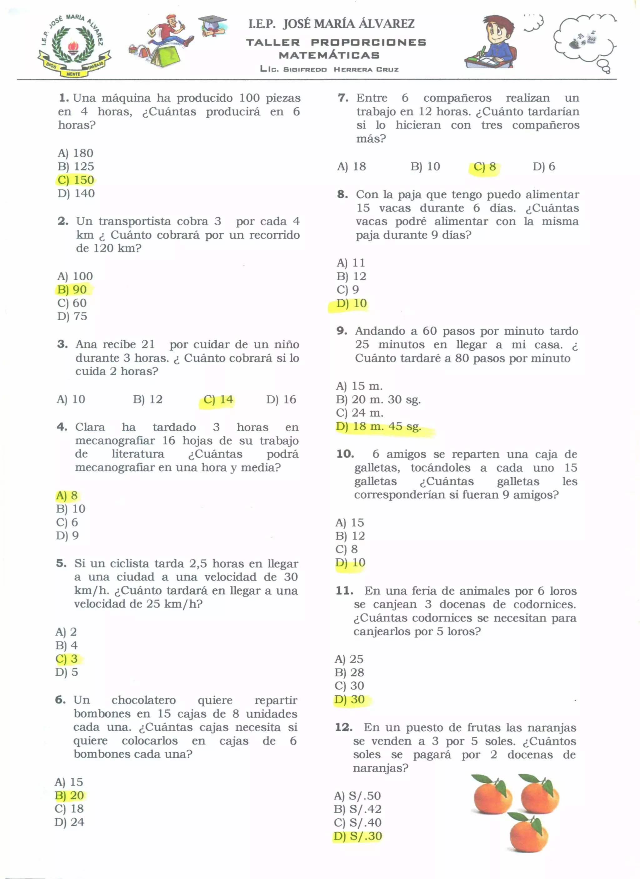 Este documento contiene 12 problemas de proporciones y porcentajes matemáticos. Cada problema presenta una situación cotidiana y varias opciones de respuesta para determinar cuál es la solución correcta. Los problemas incluyen cálculos relacionados a la velocidad, el tiempo, la producción, las tasas y los repartos entre grupos.