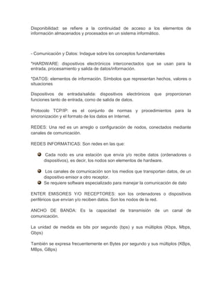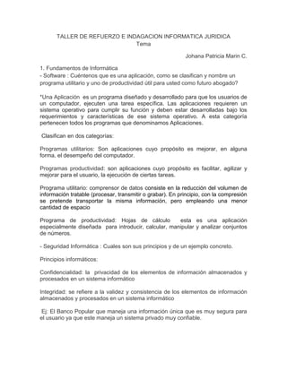 Este documento presenta información sobre varios temas de informática jurídica. Explica conceptos como aplicaciones, software, seguridad informática, hardware, redes y comunicación de datos. También describe las diferencias entre la Web 1.0 y 2.0, mencionando ejemplos como Google, YouTube y Wikipedia. Finalmente, cubre temas como el paradigma de la propiedad intelectual, tipos de software, divisiones de la informática jurídica y los cambios introducidos por la nueva Ley de Tecnologías de Información y Comunicaciones de Colombia.
