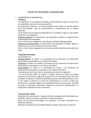 Este documento presenta información sobre un taller de refuerzo e indagación sobre temas de informática y derecho. Incluye secciones sobre fundamentos de informática como software y seguridad informática, herramientas web 2.0, propiedad intelectual, informática jurídica y la ley de tecnologías de la información y las comunicaciones de Colombia. El documento ofrece conceptos clave, ejemplos y comparaciones sobre estos temas relevantes para el derecho y la tecnología.