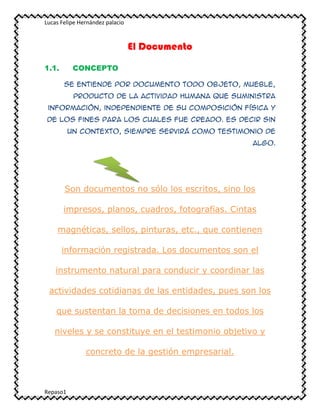 Este documento define el concepto de documento y clasifica los diferentes tipos de documentos. Define un documento como cualquier objeto creado por el ser humano que proporciona información, independientemente de su forma física. Luego clasifica los documentos según su soporte, incluyendo documentos en papel, gráficos, de imagen, cintas magnéticas, y otros soportes como discos.