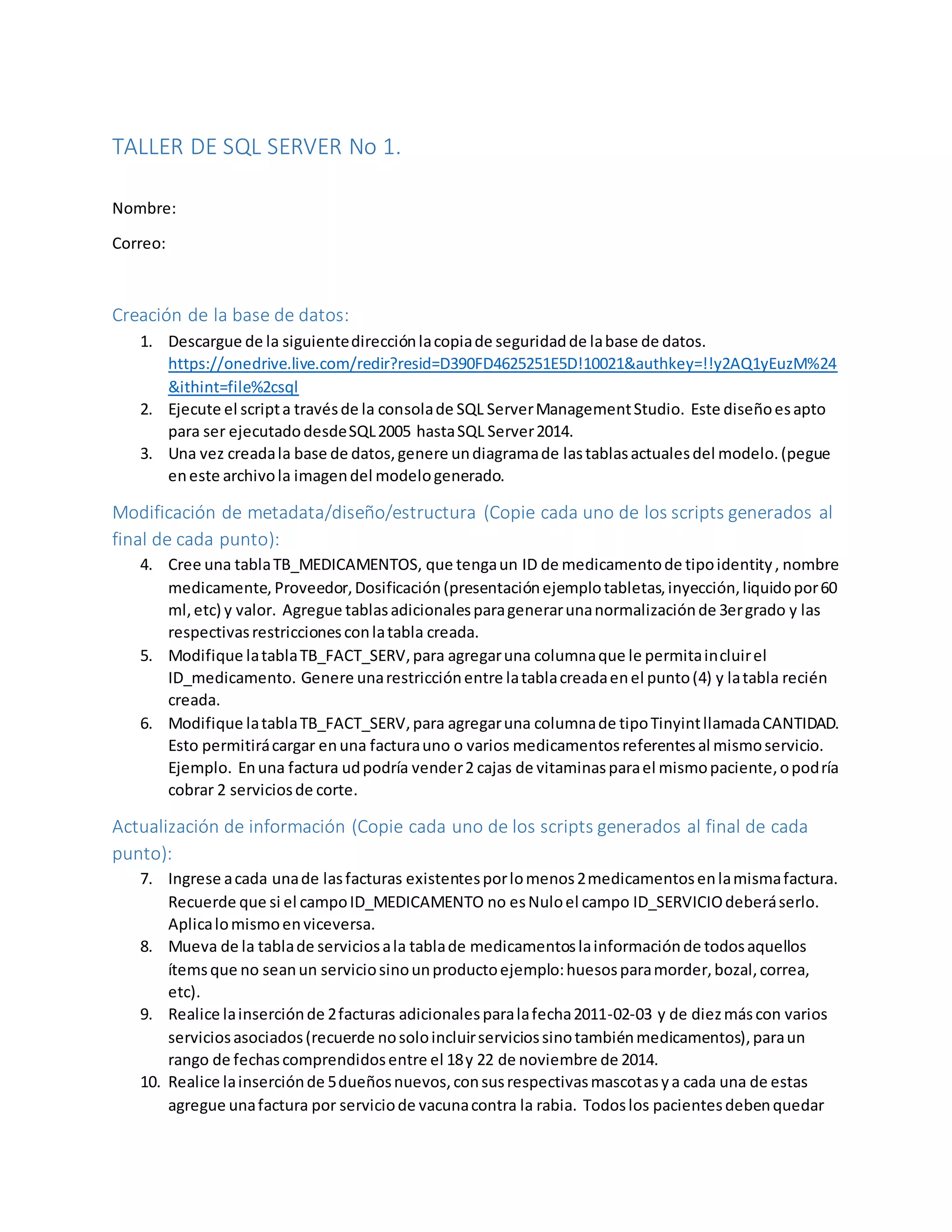 El documento detalla un taller sobre SQL Server que incluye la creación y modificación de bases de datos, así como la actualización de información y la realización de consultas básicas. Se abordan pasos específicos para crear tablas, insertar datos y generar informes relacionados con medicamentos y servicios en un contexto veterinario. Además, se incluyen scripts SQL para ejecutar diversas operaciones en la base de datos a lo largo del taller.