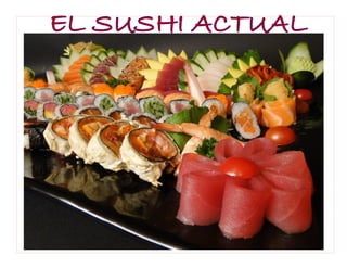 El documento proporciona información sobre el origen y la evolución del sushi. Explica que el sushi se originó en China como un método de conservación de pescado mediante el moho y la fermentación con arroz. Más tarde, los cultivadores de arroz japoneses descubrieron que el pescado fermentado con arroz cocido era comestible, dando origen al haya-zushi. El estilo nigiri-zushi fue creado durante el período Edo en Japón y es la forma más común de sushi en