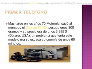 Más tarde enlos años 70 Motorola, sacó al mercado el DynaTAC 8000X pesaba unos 800 gramos y su precio era de unos 3.995 $ (Dolares USA), un problema que tenía este mod