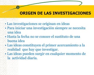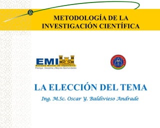 Este documento presenta los pasos metodológicos para elegir un tema de investigación científica. Explica que las ideas surgen de diversas fuentes y cómo generarlas. Luego, detalla cómo definir el tema, incluyendo preguntas de reflexión y priorizando la búsqueda bibliográfica. Finalmente, cubre aspectos como formular el problema, objetivos e hipótesis para organizar el proyecto de investigación.