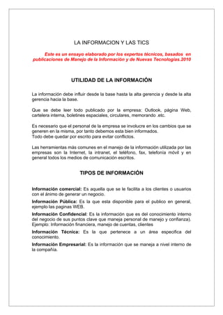 Este documento describe la importancia de la información y las tecnologías de la información y la comunicación (TIC) para las empresas. Explica que la información debe fluir entre todos los niveles de una empresa y que las herramientas TIC como Internet, intranet y teléfonos son fundamentales para el manejo de información. También define diferentes tipos de información y describe cómo las páginas web y otras tecnologías digitales son medios importantes pero que aún no se usan lo suficiente para comercio electrónico en Colombia.