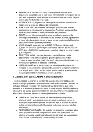 El documento habla sobre la información, su utilidad y tipos. Define la información como un conjunto organizado de datos procesados que constituyen un mensaje. Explica que la información se utiliza para producir conocimiento y tomar decisiones. Describe varios tipos de información como saber, conocimiento, tecnología y derechos. También define nuevos medios de comunicación como correo electrónico, chat, páginas web, mensajería instantánea, foros virtuales y blogs.
