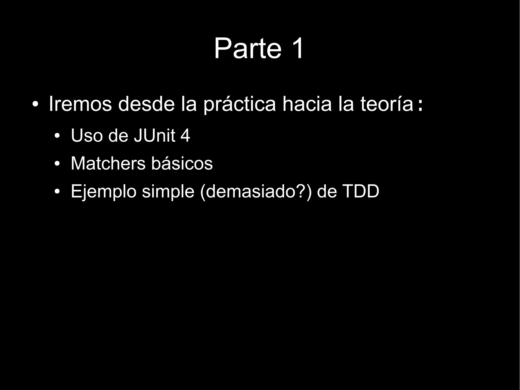 Este documento presenta una introducción a unit testing y TDD en Java. La sesión se dividirá en varias partes, comenzando con una demostración práctica de JUnit y matchers básicos, seguida de más detalles sobre otros matchers, mock objects y ejemplos de TDD. El documento también incluye enlaces a lecciones de código de ejemplo para practicar diferentes aspectos de testing unitario.