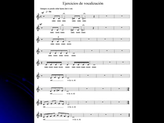 Este documento presenta un taller de vocalización con el objetivo de revisar los aspectos más importantes del trabajo vocal y el canto. Explica las tres partes del aparato vocal - respiratorio, de fonación y de resonancia - y la importancia de la relajación y la respiración controlada. Detalla ejercicios vocales para ampliar la extensión, el volumen y la capacidad respiratoria, así como lograr homogeneidad y agilidad en todas las vocales y registros.