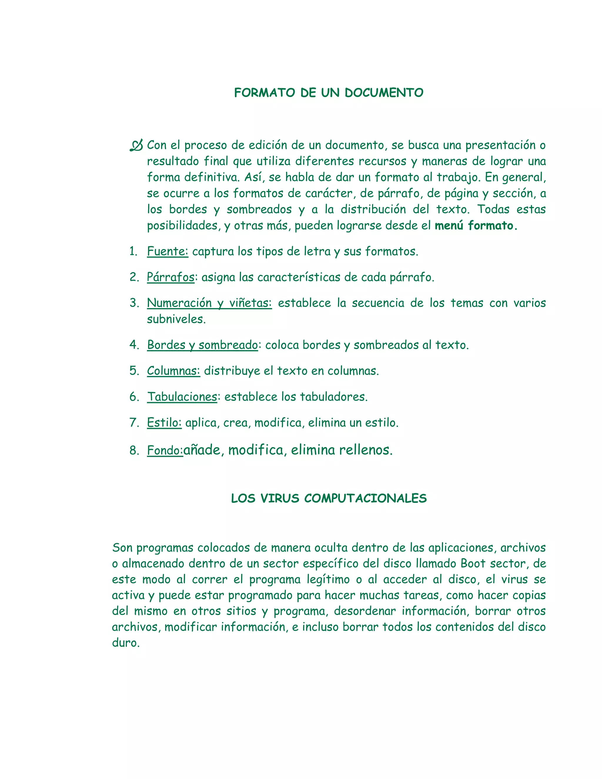 El documento habla sobre el formato de un documento y explica que con el proceso de edición se busca darle una presentación final utilizando recursos como fuentes, párrafos, numeración, bordes, columnas, tabulaciones, estilos y fondo, los cuales se pueden modificar desde el menú formato.