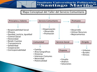 Este documento presenta un mapa conceptual sobre el taller de servicio comunitario. Describe los principios y valores del servicio comunitario como la responsabilidad social, equidad e igualdad. Explica que el servicio comunitario se dirige a las comunidades urbanas, rurales y étnicas para estudiar sus necesidades y proponer soluciones. También resume los objetivos del gobierno venezolano de promover un nuevo modelo socialista, productivo e inclusivo para el país.