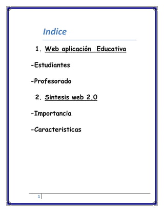 El documento describe las aplicaciones educativas de la web 2.0 y sus características. La web 2.0 permite nuevos roles para profesores y estudiantes basados en el trabajo autónomo, colaborativo, crítico y creativo. Proporciona entornos para compartir recursos y construir conocimiento de forma colaborativa. Para aprovecharla en educación se requiere infraestructura como intranet, aulas con ordenadores y conexión a internet, así como competencias digitales en estudiantes y profesores.
