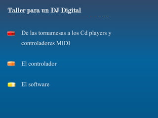 Desde el año 2000 se ha popularizado el DJ digital que usa un controlador físico MIDI, interfaz de audio y software en lugar de tornamesas. Un controlador permite mapear funciones de manera versátil y facilita la movilidad sin equipos grandes o colecciones de CDs. El software más usado incluye Ableton, Traktor, Virtual DJ y el gratuito Mixxx, mientras que los controladores populares son de marcas como Pioneer, Numark, Denon y Hercules.