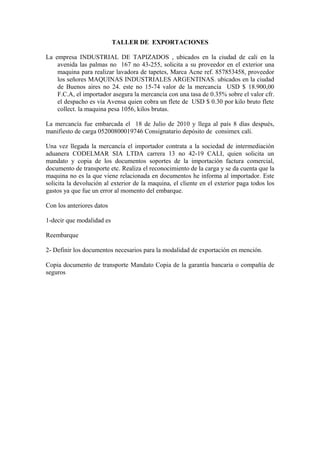 La empresa Industrial de Tapizados importó una máquina de lavado de tapetes de la compañía Maquinas Industriales Argentinas. Sin embargo, cuando la mercancía llegó a Colombia, se determinó que no era la máquina descrita en los documentos. Por lo tanto, la mercancía será devuelta al exterior, cubriendo el exportador original todos los gastos, dado que fue un error en el embarque. Para gestionar la devolución, se requieren documentos como el conocimiento de embarque, mandato aduanero y garantía bancaria.
