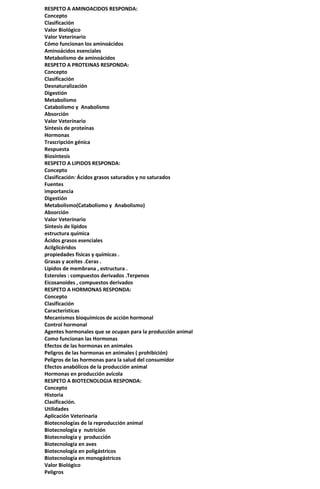 El documento cubre los temas de aminoácidos, proteínas, lípidos, hormonas y biotecnología. Describe los conceptos básicos, clasificaciones, funciones, metabolismo, importancia y aplicaciones veterinarias de cada uno, así como los peligros potenciales relacionados con las hormonas y la biotecnología.