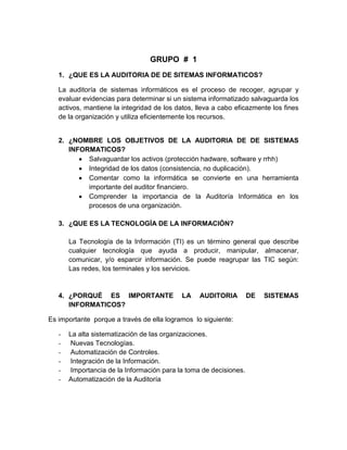 El documento presenta preguntas y respuestas sobre auditoría de sistemas informáticos de tres grupos diferentes. Explica conceptos como auditoría de sistemas, objetivos de la auditoría, tecnología de la información, importancia de la auditoría y certificaciones como CISA, CISM, CGEIT y CRISC. Además, indica que en Ecuador existe un capítulo de ISACA en Quito donde los profesionales se reúnen para conferencias y desarrollo de estándares sobre control y auditoría de sistemas de información.
