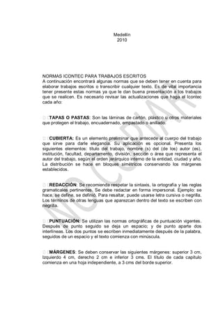Este documento presenta las normas Icontec para la elaboración de trabajos escritos. Explica las normas para elementos como cubierta, redacción, puntuación, márgenes, contenido, glosario, introducción, capítulos, conclusiones y bibliografía. Incluye un ejemplo de nomenclatura para dividir y enumerar secciones de un trabajo. Concluye que estas normas son importantes para mejorar la presentación de los trabajos escritos.