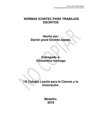 Este documento presenta las normas ICONTEC para la elaboración de trabajos escritos. Describe las normas para la cubierta, redacción, puntuación, márgenes, contenido, glosario, introducción, capítulos, conclusiones y bibliografía. El documento fue elaborado por Daniel Yesid Giraldo Zapata para el Colegio Loyola para la Ciencia y la Innovación en 2010 y presenta las normas actualizadas por el ICONTEC.