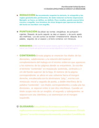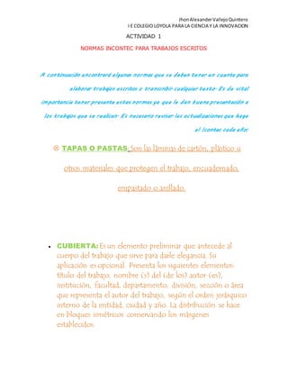 Las normas Icontec para trabajos escritos establecen reglas sobre la presentación de documentos académicos. Incluyen especificaciones para cubiertas, portadas, contenidos, capítulos, conclusiones y bibliografías. Asimismo, definen normas de redacción, puntuación y márgenes. El documento proporciona detalles sobre cada elemento y su formato correcto para garantizar una buena presentación.