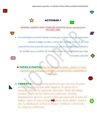 Este documento presenta las normas ICONTEC para trabajos escritos según la sexta actualización de la NTC1486-2008. Explica aspectos como la cubierta, portada, contenido, introducción, capítulos, conclusiones, bibliografía, entre otros. Además, detalla reglas de puntuación, redacción, márgenes y formato que deben seguirse para elaborar documentos académicos y darles una buena presentación.