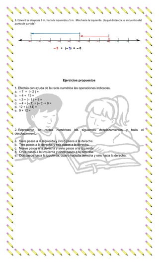 Este documento explica los desplazamientos en la recta numérica. Define un desplazamiento como un cambio de posición cuando un cuerpo se mueve. Explica que las posiciones a la derecha del origen son positivas y las de la izquierda son negativas, y que los desplazamientos en la misma dirección se suman mientras que en direcciones opuestas se restan. Proporciona ejemplos de cálculos de desplazamientos totales usando la recta numérica.