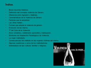 Este documento presenta un taller sobre violencia de género realizado en Andalucía en 2009. Incluye definiciones de violencia de género y violencia doméstica, factores que perpetúan la violencia contra la mujer, formas que adopta la violencia como física, psicológica y sexual, y estadísticas sobre la prevalencia de la violencia contra la mujer en España y el mundo. El taller analiza el tema desde una perspectiva histórica y legal, así como los roles de género y factores culturales, económicos