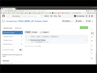 Este documento es una introducción práctica a Git, presentada por los desarrolladores Francisco Gortázar y Micael Gallego, que abarca desde la instalación hasta la gestión de conflictos en repositorios. Se describen las características fundamentales de Git, como su estructura descentralizada, el concepto de 'snapshots', y la identificación de commits. También se incluyen procedimientos para trabajar con cuentas de GitHub, crear ramas, y manejar conflictos entre desarrolladores.