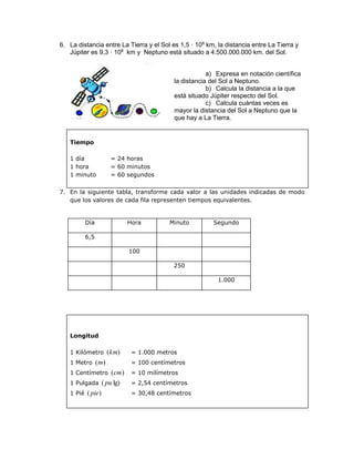 El taller propone realizar una caricatura sobre la historia de la física, una investigación sobre un tema libre siguiendo el método científico, y ejercicios de conversión entre notación científica y escrita con cifras, así como cálculos sobre distancias en el sistema solar y conversiones entre unidades de tiempo y longitud.