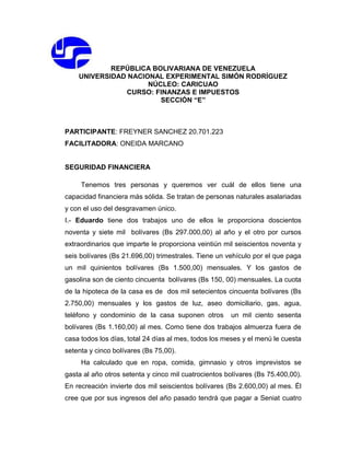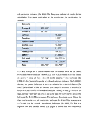 Este documento presenta tres casos de personas naturales y analiza su situación financiera y capacidad de ahorro. Eduardo tiene dos trabajos y varios gastos fijos mensuales. Lucía trabaja y da clases particulares, pagando una hipoteca. Carlos y Susana son una pareja casada con ingresos de sus trabajos y varios gastos compartidos como una hipoteca y gastos del hogar. Se calcula el enriquecimiento neto de cada caso y cómo deben declararlo ante el ente tributario.