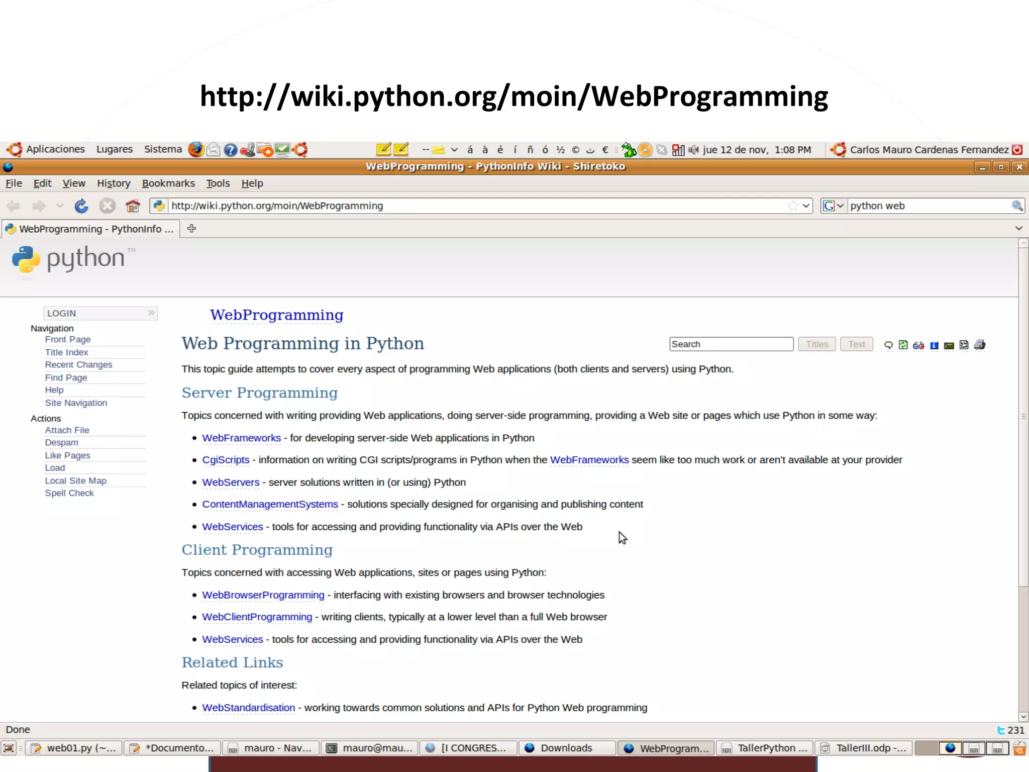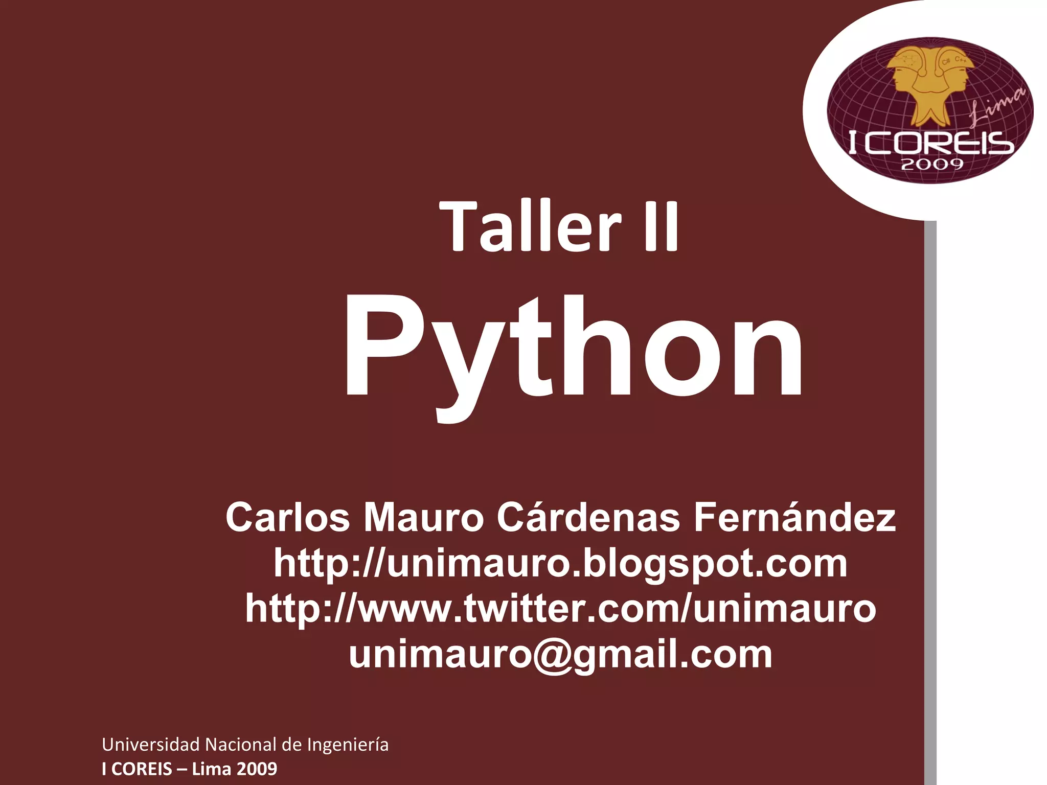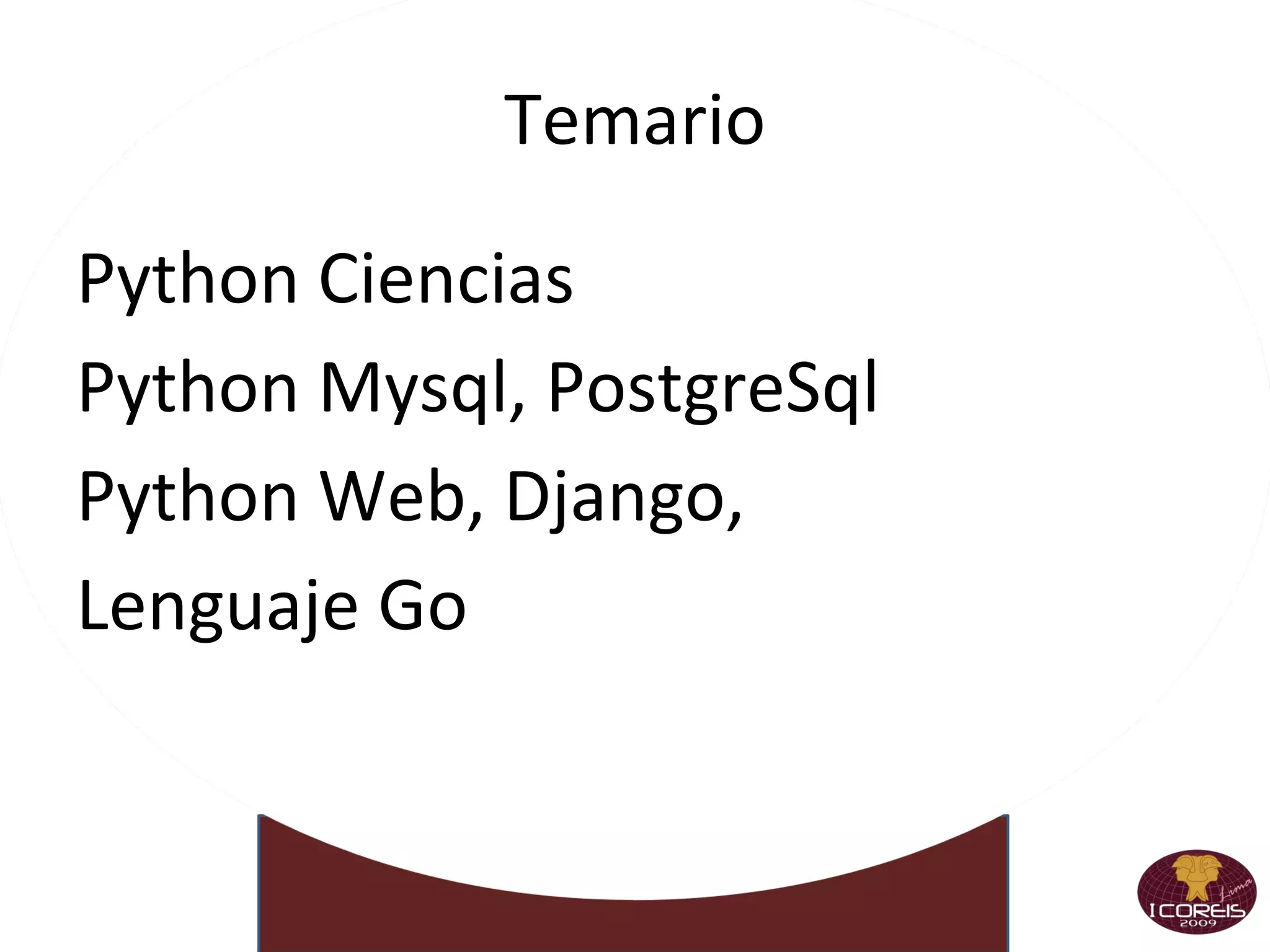 El documento presenta información sobre un taller de Python. Incluye los siguientes temas: ciencias con Python usando bibliotecas como NumPy, Matplotlib y Chaco; bases de datos con Python usando MySQL, PostgreSQL y SQLite; desarrollo web con Python y Django; y correo electrónico con Python. También menciona brevemente al lenguaje Go y provee código de ejemplo para varios de los temas.