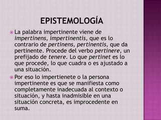 El documento define lo que significa ser impertinente, explicando que se refiere a algo que no es adecuado o aplicable a una situación en particular. Luego cita a tres autores que argumentan que a veces lo impertinente puede ser válido como una forma de criticar modelos dominantes o cuando la sociedad se vuelve impertinente hacia aquellos que ostentan el poder. Finalmente, cita a Güinter Wallraff alabando el periodismo de la impertinencia.