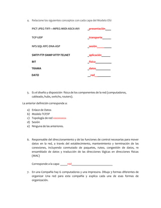 El documento habla sobre redes y conceptos relacionados como el modelo OSI, capas de red, topologías de red, protocolos, tipos de servidores y más. Explica conceptos clave de redes como switch, hub, VPN, LAN, MAN, WAN e introduce los protocolos TCP, IP y HTTP. También analiza cómo las tecnologías de comunicación han influido en la globalización y el conocimiento humano.