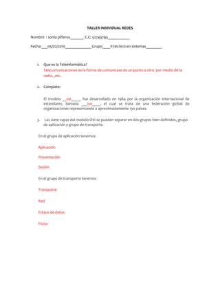 El documento describe conceptos clave relacionados con redes, incluyendo el modelo OSI, capas de red, topologías de red, protocolos, tipos de servidores y más. Explica diferentes formas de organizar una red para una compañía con 6 computadoras y una impresora, incluyendo topologías en bus, anillo y estrella. También define términos como VPN, switch, hub, protocolo, servidor dedicado y clasificación de redes según su tamaño.