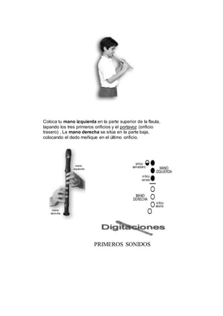 El documento describe el método didáctico para aprender a tocar la flauta dulce. Explica que la respiración correcta es la base y consiste en inspiración, pausa y espiración. Luego detalla cómo emitir el sonido correctamente y la postura del cuerpo para sostener la flauta. Procede a enseñar los primeros sonidos (Do, Re, Mi etc.) y ejercicios para practicarlos, incluyendo instrucciones sobre la digitación y soplido necesarios para cada nota.