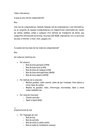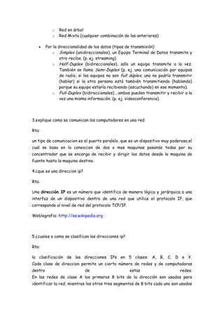 Una red de computadoras conecta equipos como computadoras y dispositivos para compartir información y recursos. Las redes se clasifican por su alcance, método de conexión, relación funcional, topología y direccionalidad de los datos. Una dirección IP identifica de manera lógica a un dispositivo dentro de una red IP y las direcciones IP se clasifican en cinco clases (A, B, C, D y E) dependiendo de cómo dividen la dirección entre la identificación de red y dispositivo.